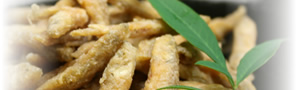 田県八郎潟で漁獲されたワカサギをサクサクの唐揚げにして醤油の風味を付けました。醤油の香りが素材の味を引き立てています。